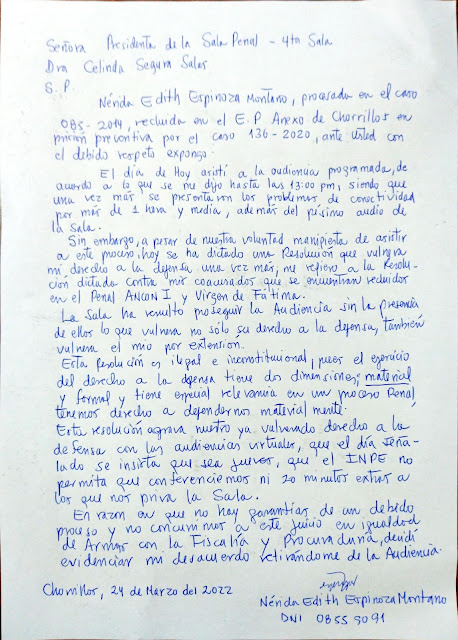 El día de hoy 24 de marzo, asistí a la audiencia programada. Desde un inicio se presentaron problemas en la conectividad y audio. Lo más serio es que no estaban presentes y conectados los procesados internos del Penal Ancón 1, y en el caso de mi coinculpada del Penal de Fátima, la sacaron de la audiencia por estar su Sala ocupada para otra Audiencia. Mi abogado y los abogados de la defensa plantearon con justa razón que se suspenda la audiencia ante la ausencia de los coinculpados.